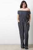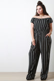 This plus size jumpsuit features a wide cut legs design, cinched high waist seam, off the shoulder neckline, and short sleeves. Accessories sold separately. 100% Rayon.