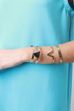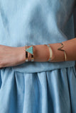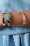 These bracelet set features marbled triangle shaped stone cuff, hammered texture cuff, and single v-shape design cuff.