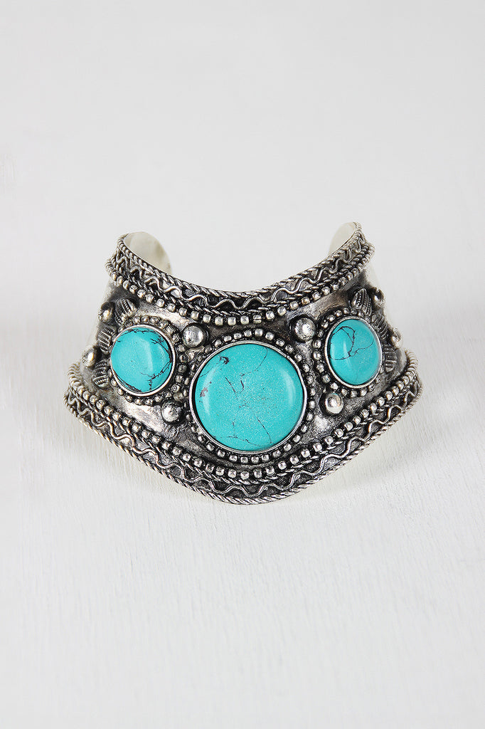 This cuff bracelet features a metallic finish, multiple marble stones, and beads and wiring detailed band. Finished with open ends for easy on/off.
