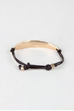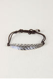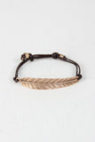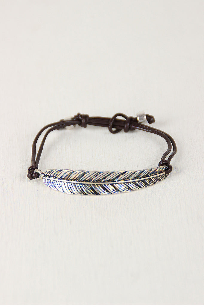 This simple bracelet features a metallic feather charm with waxed leather cord and adjustable double knot pull string closure with metal bead details.