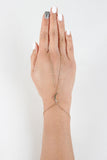 This delicate hand chain features a thin curb link chain, simple gold toned crescent moon charm and an adjustable lobster claw closure.