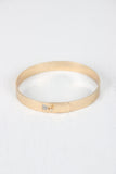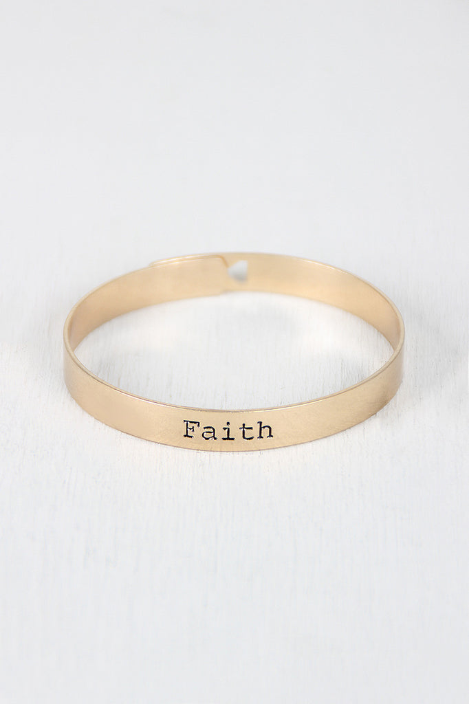 This simple cuff bracelet features stamped lettering that says "Faith", a brushed metal finish, and a post and hole locking closure.