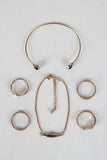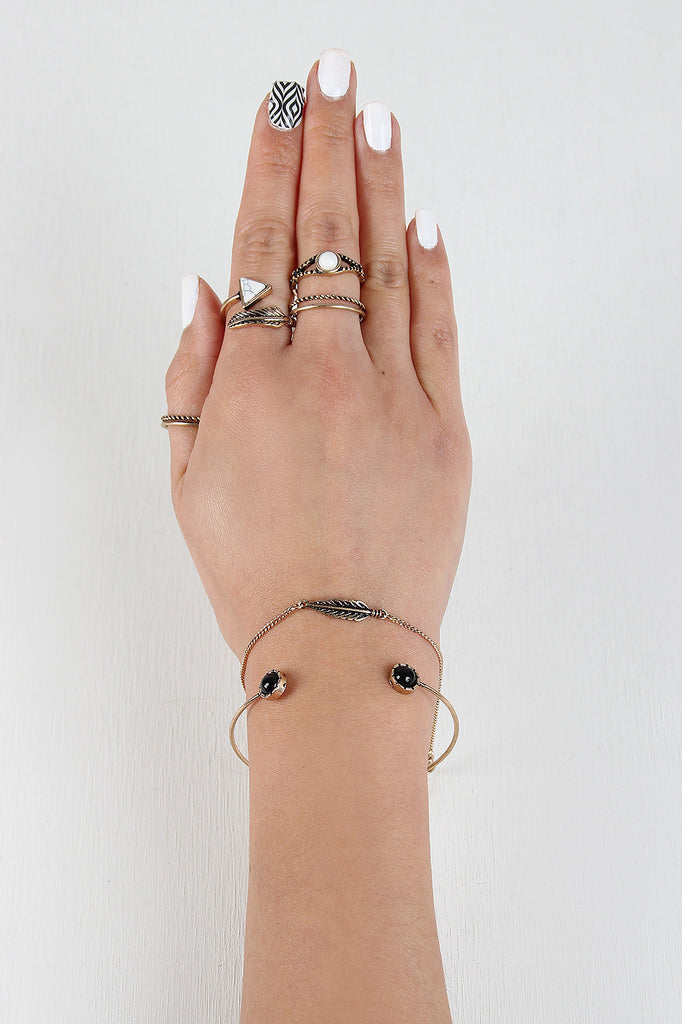 This ring set features two bracelets, a wire cuff and adjustable chain bracelet, two double band rings, one wrap stone and feather ring and one stone ring.