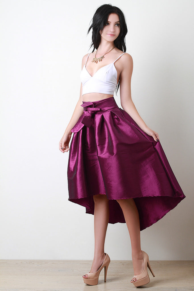 This gleaming high-low skirt is taffeta bodice with a fitted pleated waist. Designed with a hidden side zipper and a self-tie bow belt. Accessories sold separately. Made in U.S.A. 60% Polyester, 35% Nylon, 5% Spandex.