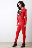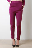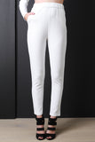 These tapered  pants  feature a stretchy crepe texture fabric, elastic waistband, and side pockets. Accessories sold separately. 97% Polyester, 3% Elastane.