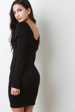 This dress features a fully lined knit fabrication with a butterfly cross on the front leading to the shoulders and a slight open back. Has a v-neck with long sleeves and is mini in length. Accessories sold separately. Made in U.S.A. 95% Rayon, 5% Spandex.