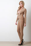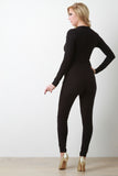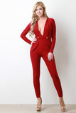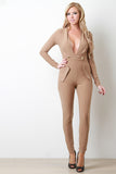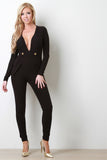 A sleek and soft jumpsuit featuring an open mandarin collar with plunging v-shape front, long sleeves, and tapered legs. Finished with a double button placket at the waist, glossy brushed texture buttons, and faux pocket flaps. Accessories sold separately. Made in U.S.A. 92% Polyester, 8% Spandex.