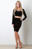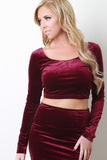 This  crop top  features soft velvet, scoop neckline, and long sleeves. Accessories sold separately. 95% Polyester, 5% Spandex.