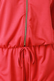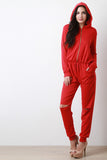 A hooded jersey jumpsuit featuring a zippered front, elasticized waist with faux drawstring, and long sleeves. Also features a cuffed sweatpants bottom with slits at the knees and side pockets. Accessories sold separately. Made in U.S.A. 60% Polyester, 35% Rayon, 5% Spandex.