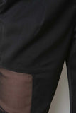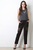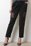 These  pants  feature solid main, semi-sheer mesh panel accents, two side pockets, partially elasticized waist, and taper cut. Accessories sold separately. Self: 97% Polyester, 3% Spandex. Contrast: 100% Polyester.