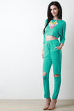 These soft terry cloth jogger style pants features a high waisted, wide elasticized waist, draw string d�cor, side pockets, knee cutout, and elasticized band hemline. Made in U.S.A. Accessories sold separately. 95% Rayon, 5% Spandex.