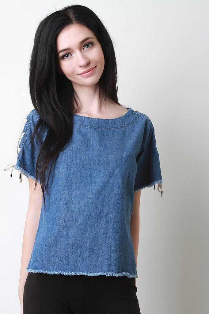 This denim top features a boat neckline, short sleeves with corset lace-up design, and side slit on both sides. Finished with with back zipper closure. Accessories sold separately. 100% Cotton.