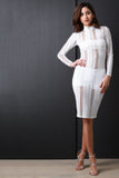 This bodycon dress features a turtle neckline, long sleeves, zipper fastener at back, sculpture fit, and semi-sheer vertical mesh fabrication. Accessories sold separately. Made in U.S.A. 95% Polyester, 5% Spandex.