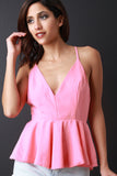 This sleeveless top features a v-neckline, princess seam, high low peplum cut design, adjustable spaghetti shoulder straps to a crisscross backless construction, and zipper fastener. Accessories sold separately. 100% Polyester.