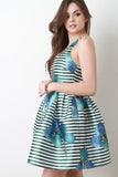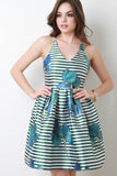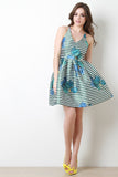 This sleeveless dress features a seamless v-neckline, high waisted seam, pleated skater flare skirt, adjustable spaghetti shoulder straps to a crisscross back, hidden zipper fastener at rear, striped floral print, and fully lined. Accessories sold separately. 80% Polyester, 20% Cotton. Lining: 100% Polyester.