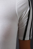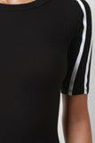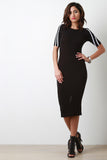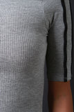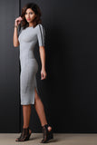 This dress features a ribbed knit fabrication, round mock neckline, and quarter sleeve construction. Finished with sleeve lining detail and center back slit. Accessories sold separately. Made in U.S.A. 95% Rayon, 5% Spandex.