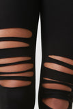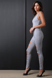 This jumpsuit features a jersey knit fabrication, sleeveless construction, scoop neckline, and curve hugging. Finished with ripped designs at front. Accessories sold separately. Made in U.S.A. 95% Cotton, 5% Lycra.