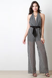 This polka-dots print on semi-sheer chiffon, deep v-neckline, self-tie halter neckline, backless design, wide leg pants, contrasting self-tie waist sash, and shorts underlay. Accessories sold separately. Made in U.S.A. 100% Polyester.