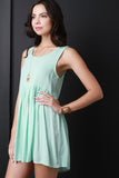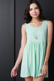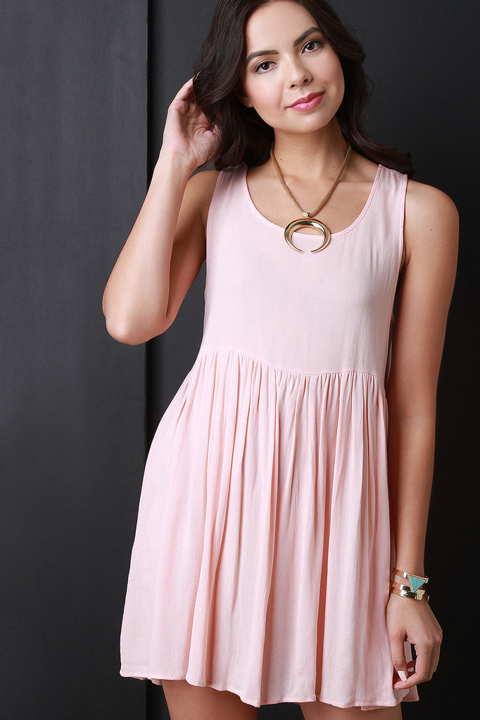 This sleeveless babydoll dress features a open lace up back, button at nape, loose fit and a gathered waist line. Accessories sold separately. Made in U.S.A. 100% Rayon.
