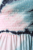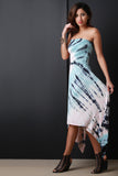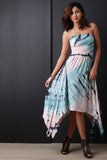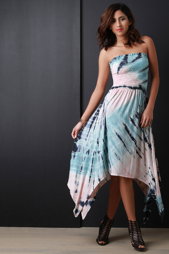 This dress features a jersey knit tie dye fabrication, strapless, smocked at bodice and finished with an asymmetrical hemline. Accessories sold separately. Made in U.S.A. 48% Polyester, 48% Rayon, 4% Spandex.