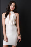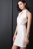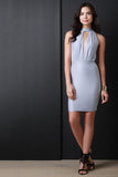 This chic dress features a plunging v keyhole, mock choker neckline, and sleeveless construction. Finished with double button elasticized hook at nape with back keyhole. Accessories sold separately. Made in U.S.A. 87% Polyester, 13% Spandex.