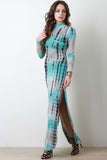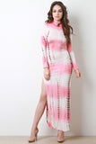 This tie dye maxi dress features a mock neck, two thigh high side slits, a lower back peek a boo detail, rounded hem, and a soft knit fabrication. Made in U.S.A. Accessories sold separately. 95% Polyester 5% Spandex.