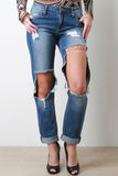 These boyfriend jeans feature a large cutouts, vintage fading, and shredded holes. Finished with a belt loops, classic 5-pocket design, low rise construction, cuffed hem, slightly slouchy boyfriend-style silhouette, and zipper fly with a single button closure. Accessories sold separately. 100% Cotton.