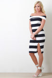 This dress features a bardot neckline, princess seam, vent slit front, bold horizontal striped design, and zipper fastener at back. Accessories sold separately. 60% Cotton, 35% Polyester, 5% Spandex.