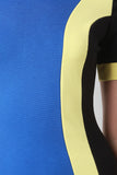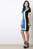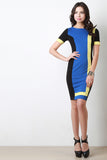 This midi dress features a thick knit fabrication with colorblock design, round neckline, short sleeve, hidden back zipper fastener, and stretchy bodycon fit. Accessories sold separately. 33% Nylon, 62% Viscose, 5% Spandex.