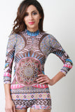 This bodysuit features abstract bohemian pattern print on semi-sheer mesh fabrication, high neckline, large keyhole cutout back, button closure at nape, quarter-length sleeves, and short bottom. Accessories sold separately. Made in U.S.A. 100% Polyester.