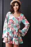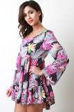 This babydoll dress features a round neckline, open back with corset cage design, long bell sleeves, ruched panel flare seam, and tropical palm pattern print. Accessories sold separately. Made in U.S.A. 100% Polyester.