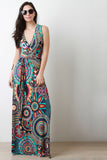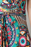 This dress features a colorful boho print, smooth stretchy knit fabrication, sleeveless construction, and surplice v-neckline. Finished with a self-tie matching belt. Accessories sold separately. Made in U.S.A. 96% Polyester, 4% Spandex.