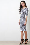 This dress features a scoop neckline, smooth stretchy knit fabrication, tribal print pattern throughout, and quarter sleeves construction. Accessories sold separately. Made in U.S.A. 95% Polyester, 5% Spandex.