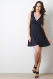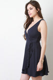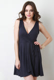 This dress features a surplice v-neckline, smooth stretchy fabrication, wrap inspired design, and sleeveless construction. Finished with a self-tie drawstring at waist. Accessories sold separately. Made in U.S.A. 95% Polyester, 5% Spandex.
