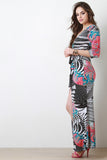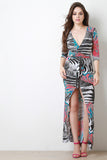 This maxi dress features a mock wrap front, deep v neckline, high slit skirt, matching tie belt and three quarter length sleeves. Accessories sold separately. Made in U.S.A. 95% Polyester, 5% Spandex.