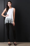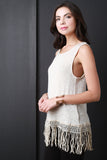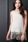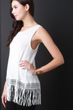 This cute top features a fringe hem, sleeveless design, scoop neckline, and a soft sweater knit fabrication.Accessories sold separately. Made in U.S.A. 58% Polyester, 38% Rayon, 4% Spandex.