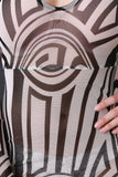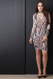 This lightweight mesh midi dress features a choker neckline with plunging v detail, button closure at nape, patterned print throughout, long sleeve design, and stretchy sculpture fit. Accessories sold separately. Made in U.S.A. 100% Polyester.