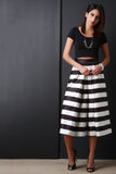 These culotte style  stripe  print satin, high waisted design, two slit pockets, wide legs, and an exposed back-zip closure. Accessories sold separately. Shell: 100% Polyester. Lining: 100% Rayon.