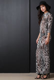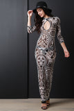 This eye-catching dress features a semi-sheer mesh fabrication with an abstract tribal print, mock neckline, front keyhole, long sleeves, and finished with a maxi-length hemline. Accessories sold separately. Made in U.S.A. 100% Polyester.
