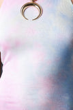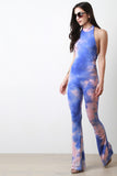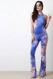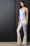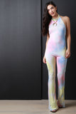 This vintage inspired tie dye fabrication, mock neck halter, backless design, bell bottom pants. finished with a double button closure at nape. Accessories sold separately. Made in U.S.A. 95% Polyester, 5% Spandex.