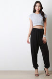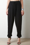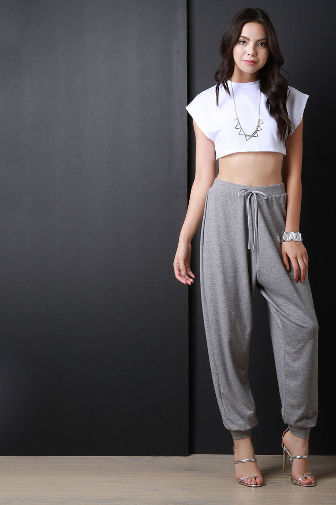 These jogger pants feature a soft jersey knit fabrication, elasticized waist with faux drawstring, and ankle cuffs hem. Accessories sold separately. Made in U.S.A. 87% Polyester, 10% Rayon, 3% Spandex.