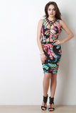 This stylish dress features a smooth stretchy knit fabrication, round neckline with caged yoke construction, and wide crisscross midriff band design. Finished with a midi length hemline. Accessories sold separately. Made in U.S.A. 95% Polyester, 5% Spandex.