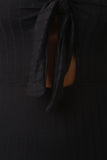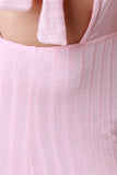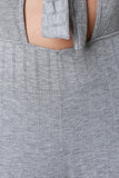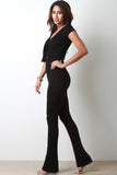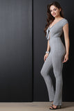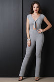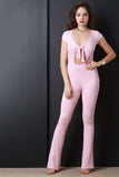This ribbed knit jumpsuit features a self-tie front, v-neckline, keyhole midsection, short cap sleeves, high waisted cinched seam, and slightly flare cut pants. Accessories sold separately. 95% Rayon, 5% Spandex.
