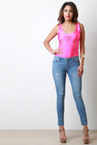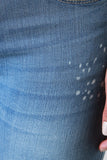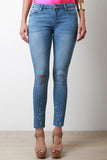 This pair of jeans features low rise silhouette, knee slits at front, classic 5 pockets, belt loops, zipper fly with single button closure, and stain wash details. Finished with a frayed hemline/ Accessories sold separately. 58% Cotton, 18% Rayon, 22% Polyester, 2% Spandex.