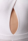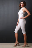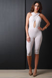 This romper features a textured knit fabrication, crisscross wrap design, keyhole cutout detail, sleeveless fit, and wide elasticized waist band. Finished with a capri-length hemline and exposed rear zip-up closure. Accessories sold separately. 68% Polyester, 29% Rayon, 3% Spandex.