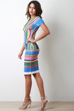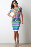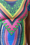 This boho tribal print throughout, scoop neckline, short sleeves design, and stretchy sculpture fit. Accessories sold separately. Made in U.S.A. 95% Polyester, 5% Spandex.