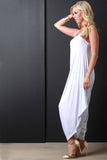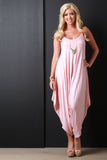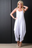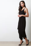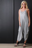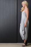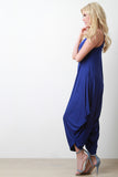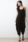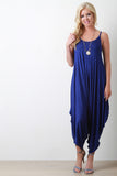 This jumpsuit features a jersey knit fabrication, scoop neckline, spaghetti straps, and loose baggy construction. Finished with a cinched side detail. Accessories sold separately. Made in U.S.A. 96% Rayon, 4% Spandex.