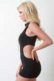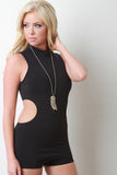 This romper features a smooth stretchy knit fabrication, mock neckline, sleeveless fit, and side to back cutout design. Finished with an exposed rear zipper fastener. Accessories sold separately. Made in U.S.A. 80% Polyester, 20% Spandex.