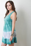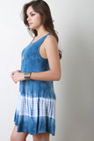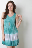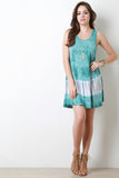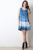 This shift dress features a sleeveless design, scoop neckline, binding finish on neck and armholes, soft knit fabrication, tie dye coloring, finished with a rounded flare hemline. Accessories sold separately. Made in U.S.A. 96% Rayon, 4% Spandex.