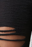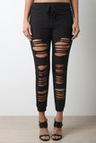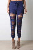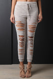 These joggers feature a knitted fabric, front razor cut slits design, and wide elasticized waist band with self-tie drawstrings. Finished with a cuffed hemline. Accessories sold separately. Made in U.S.A. 87% Polyester, 10% Rayon, 3% Spandex.